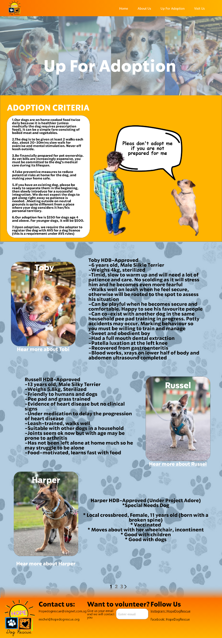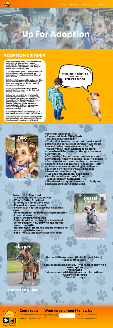 I used the logo color way for the colours for the entire website design and included a lot of text in the website because of the amount of information that is needed for people to know like the strict rules they have for adopters.